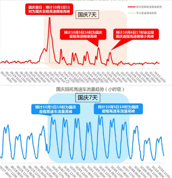 国庆期间,预计10月1日10时至11时为去程高速拥堵高峰,10月5日16时至17时为返程拥堵高峰,10月6日17时至18时为返程拥堵小高峰。