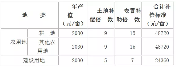 (3)耕地:土地补偿标准为48720元/亩,青苗补偿费标准为1100元/亩。总计耕地补偿标准为49820元/亩。
